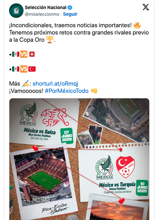 La Selección Mexicana anunció este martes, dos partidos de preparación de cara a la Copa Oro 2025. A través de redes sociales, el combinado azteca dio a conocer que Suiza y Turquía serán los rivales en estos dos cotejos. El duelo ante los suizos será en Salt Like City en el estadio Rice-Eccles y contra el cuadro turco será en el Kenan Stadium, en Carolina del Norte. El 7 de junio se realizará el juego ante Suiza y el 10 del mismo mes, se miden a la selección turca.